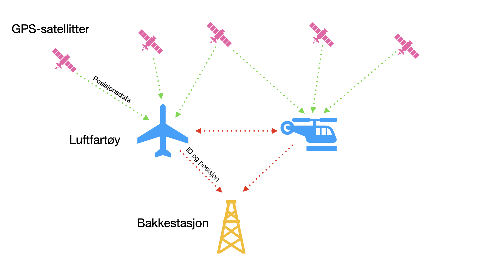 Enkelt forklart bruker fly og helikoptre GPS-satellitter for å beregne sin egen posisjon. Denne posisjonen sendes ut som et radiosignal på 1090 MHz, sammen med en unik identifikator (ICAO-adresse eller HEX-kode), fart, kompassretning og annen telemetri. Signalene sendes flere ganger per sekund og kan fanges opp både av andre luftfartøy og bakkestasjoner. Hvilke data som sendes ut kan variere noe mellom ulike luftfartøy.