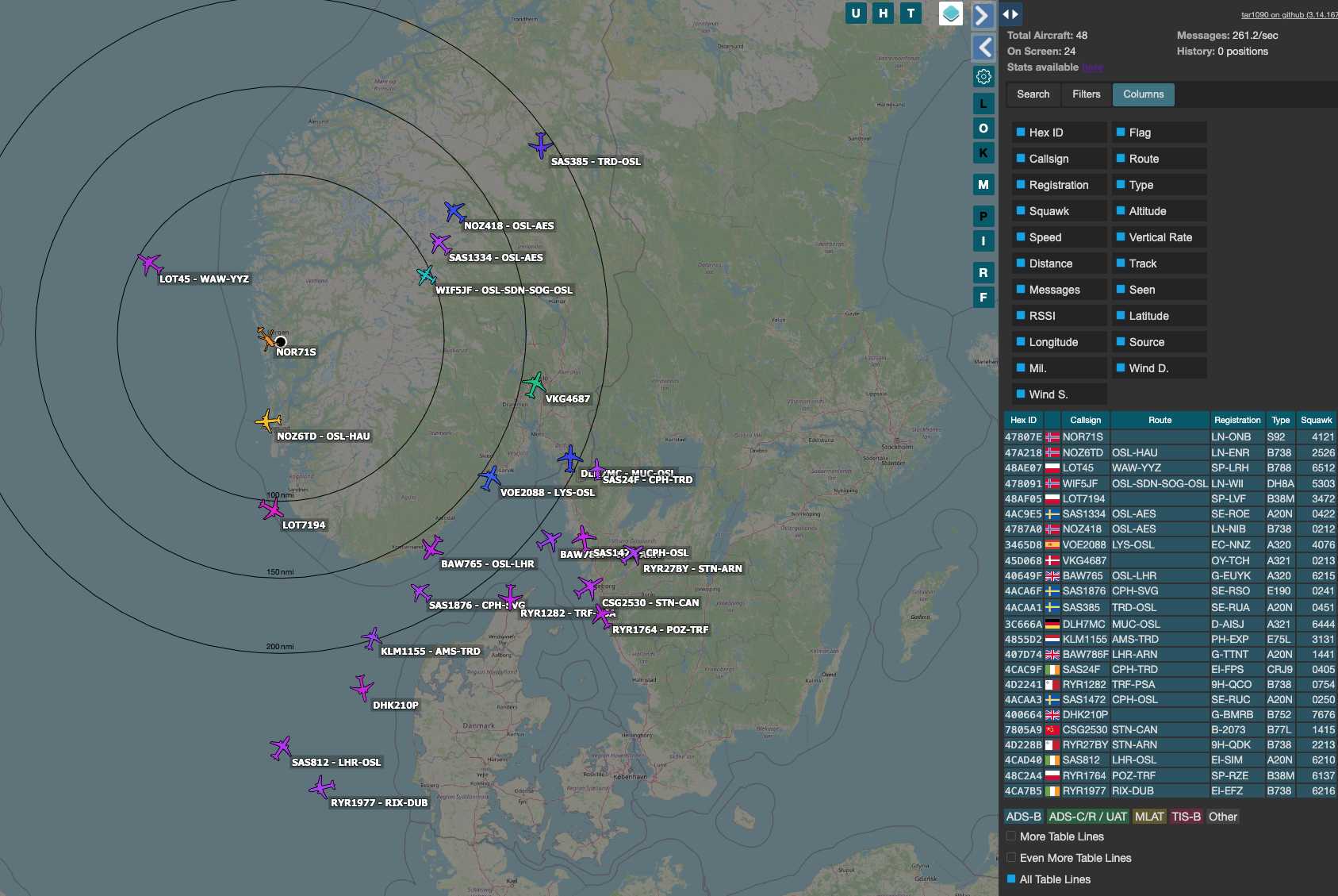 Serveren genererer også automatiske heatmaps av trafikken siste døgn. Dette kan være en svært nyttig inngangsport til videre funn. Er det en rød sirkel på kartet et sted hvor det ikke gir mening? Har noen landet med helikopter i en nasjonalpark, eller har det vært en redningsaksjon her? Eller kanskje politihelikopteret er på oppdrag? Heatmapene gir ikke alle svarene på dette, men kan peke deg i retning av hvor du bør grave dypere.