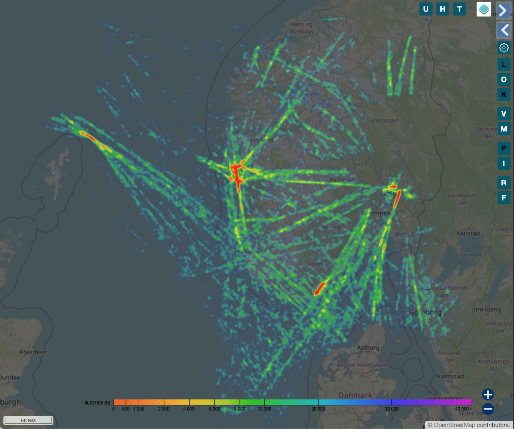 Medieklyngens ADS-B-server tilbyr to ulike heatmap-visualiseringer. Den ene er i raster, den andre er i vektor, og de utfyller hverandre fint.