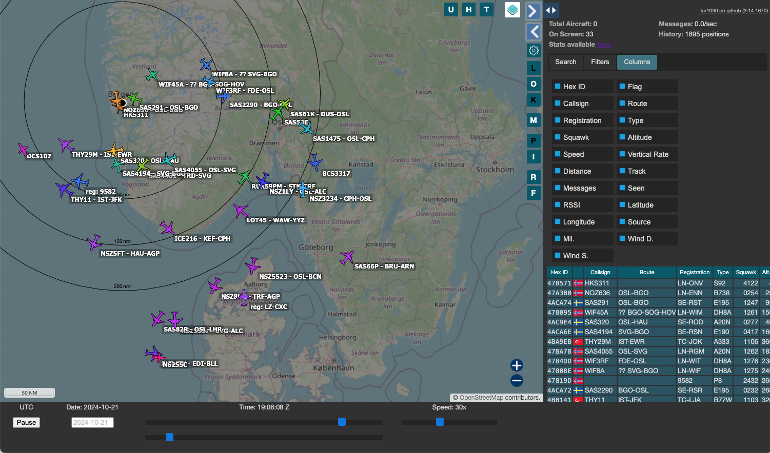 Figur 2: Replay-funksjonalitet på Medieklyngens ADS-B-server. Legg merke til avspillingskontrollene i bunnen av bildet