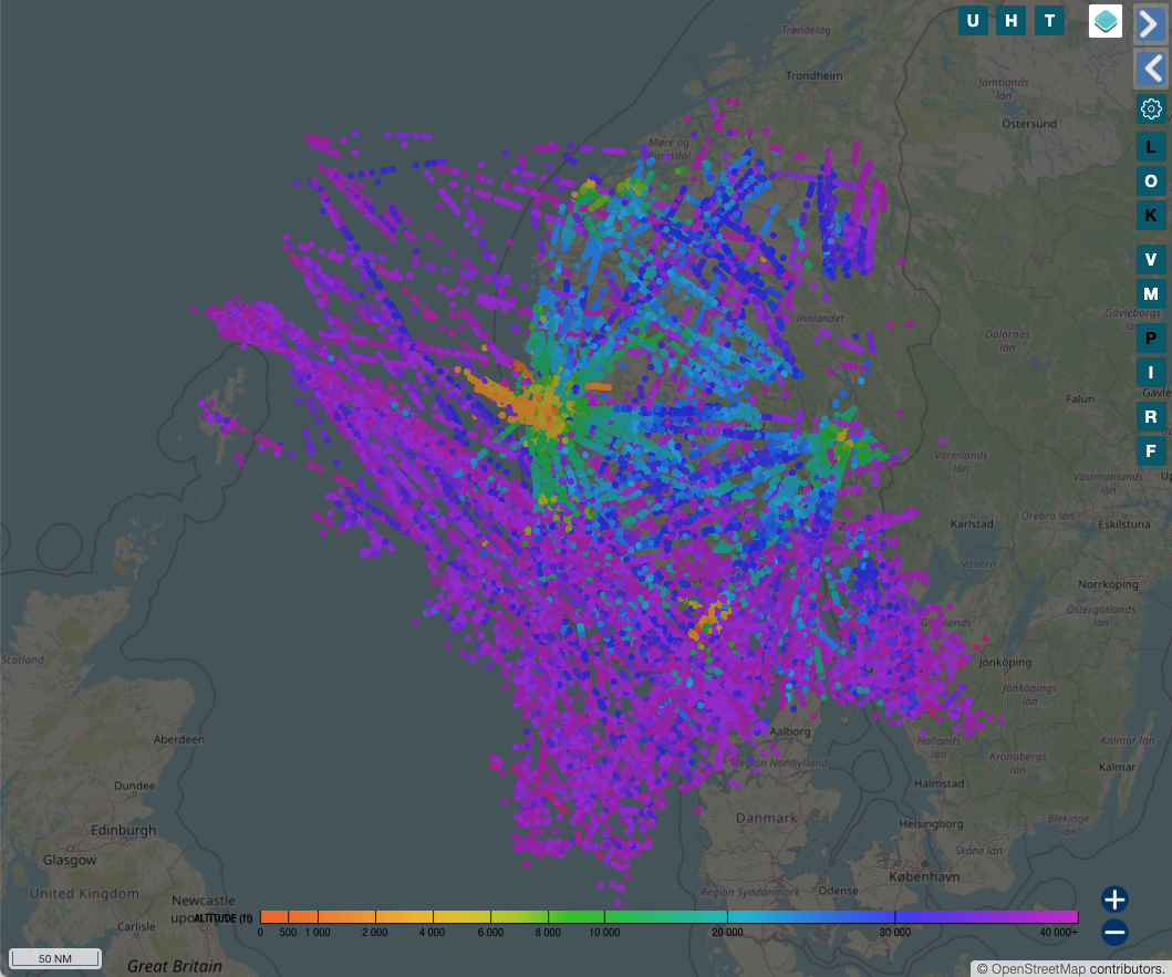 Figur 1: Sanntidsvisualisering av ADS-B-data på Medieklyngens ADS-B-server